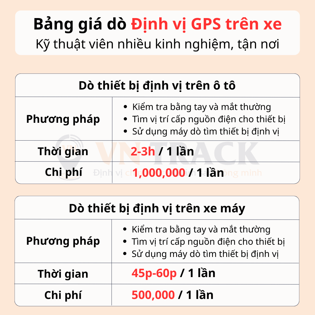 Nếu như đọc các hướng dẫn trên bạn vẫn thấy khó khăn để thực hiện, thì bạn cần sự hỗ trợ của các đơn vị chuyên nghiệp trong lĩnh vực này. Vntrack chuyên cung cấp các dịch vụ an ninh nhằm tháo gỡ các thiết bị định vị gps xe máy được lắp trái phép vào phương tiện, chưa được sử đồng ý của chủ nhân. Hãy tham khảo bảng giá bên dưới: